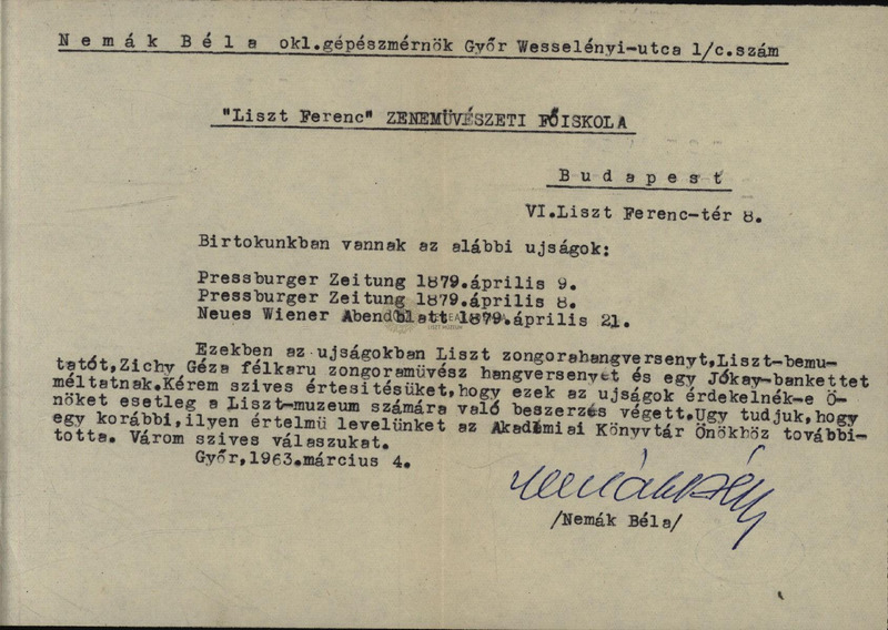 3 újságot ajánl fel megvételre a Liszt Múzeum részére. (A vétel megtörtént.)