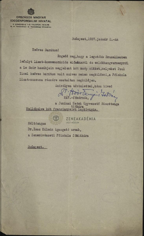 A Le Soir 1936.12.19-i és 22-i cikkeinek kísérőlevele.