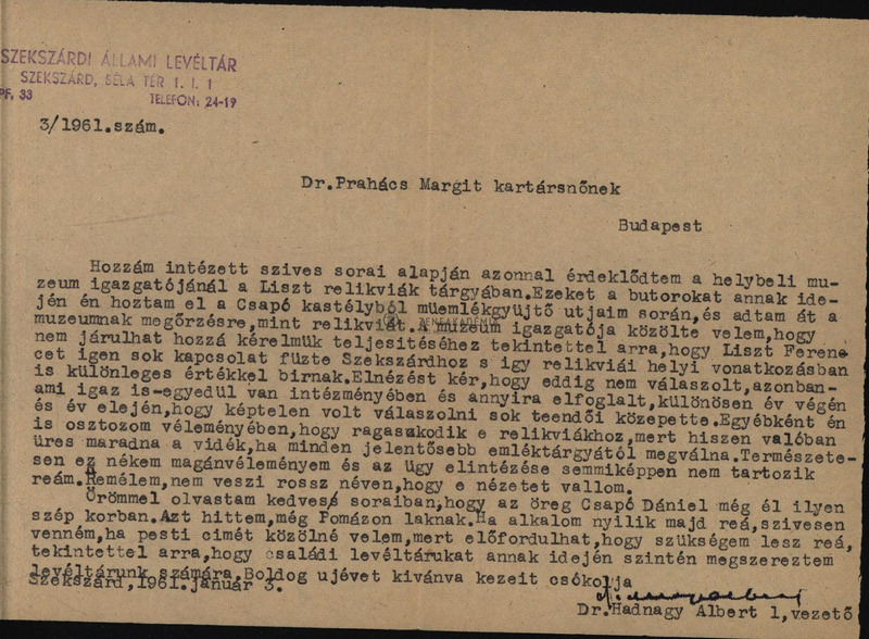 A levéltárvezető szekszárdi Liszt-relikviákról, Liszt-levelek adatai.