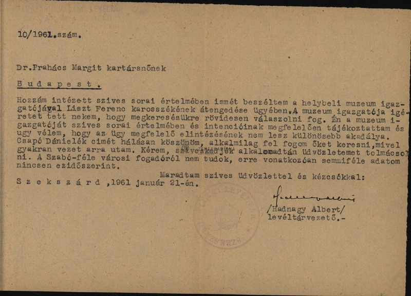 A levéltárvezető szekszárdi Liszt-relikviákról, Liszt-levelek adatai.