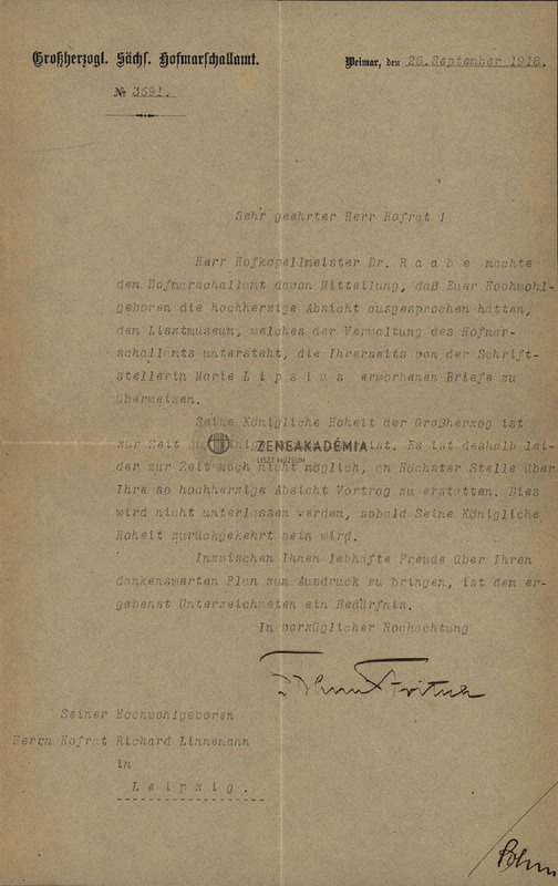 Örömmel értesült Linnemann szándékáról, hogy a La Marától átvett leveleket a weimari Liszt Múzeumnak adományozza. A nagyherceg néhány hétig távol van, hazatérésekor informálják.