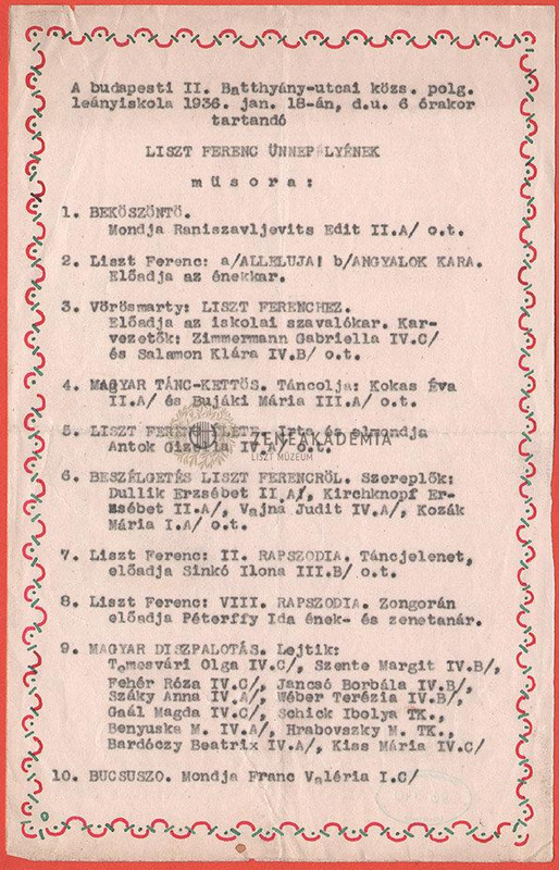 A II. ker.Batthyány utcai közs. polgári leányiskola Liszt ünnepélyének programja.