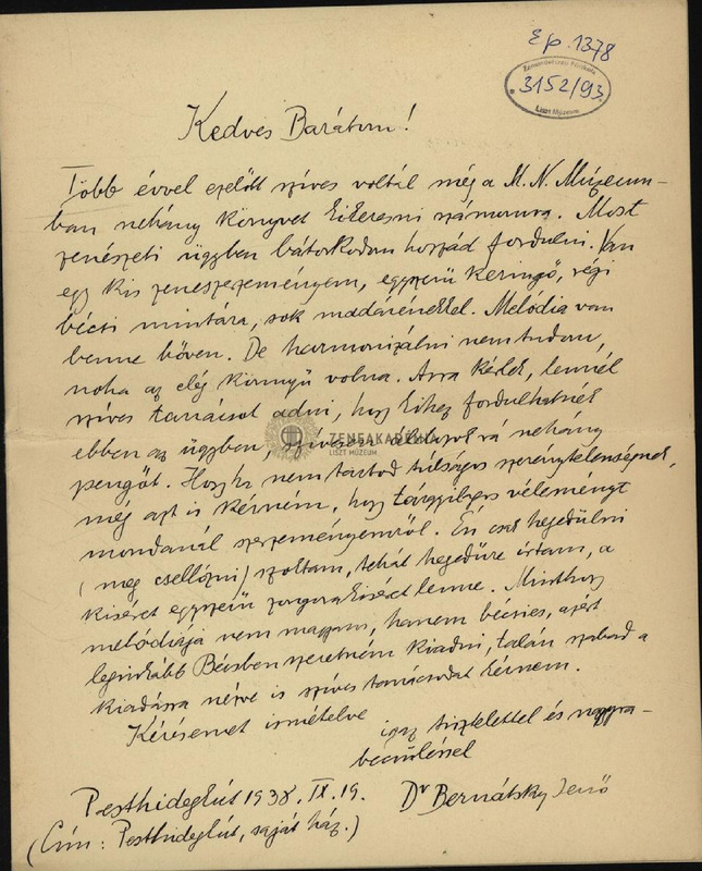 dr. Bernátsky Jenő levele Isoz Kálmánhoz