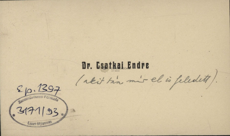 - Névjegyre írva. Három magyar vonatkozású kottát küld. Borítékon ceruzával Sopron, talán Csatkai címe, Isozé nem szerepel.