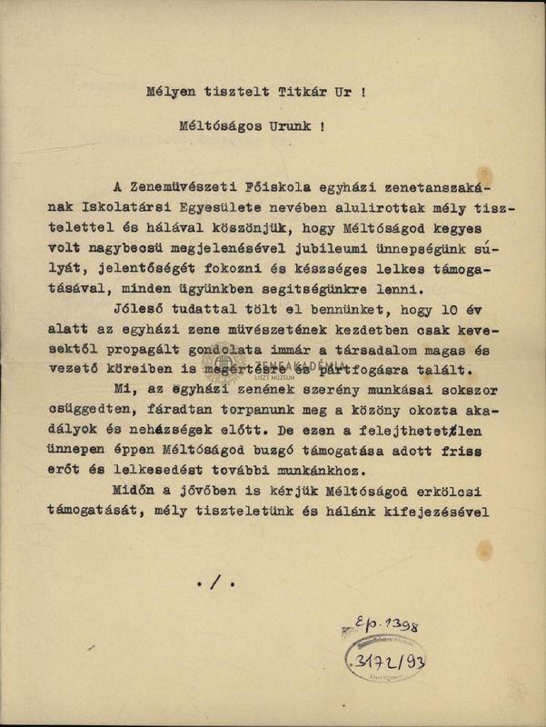 A Zeneművészeti Főiskola egyházzenei tanszakának egyesülete nevében köszönetet mond a jubileumi ünnepségen való megjelenéséért és minden pártfogásáért.