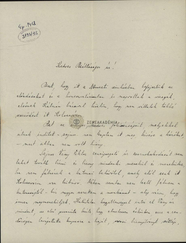 A hárfaművésznő Vaszy Viktor zeneigazgatót szidja, nem akar Kolozsvárott maradni. Szeretne állást kapni a Főiskolán, három növendéke is utánajönne.