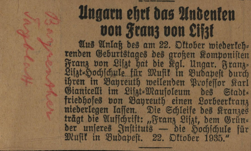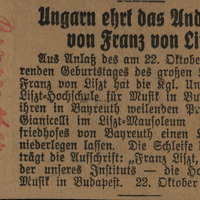 - Újságkivágat: „Ungarn ehrt das Andenken von Franz von Liszt”.