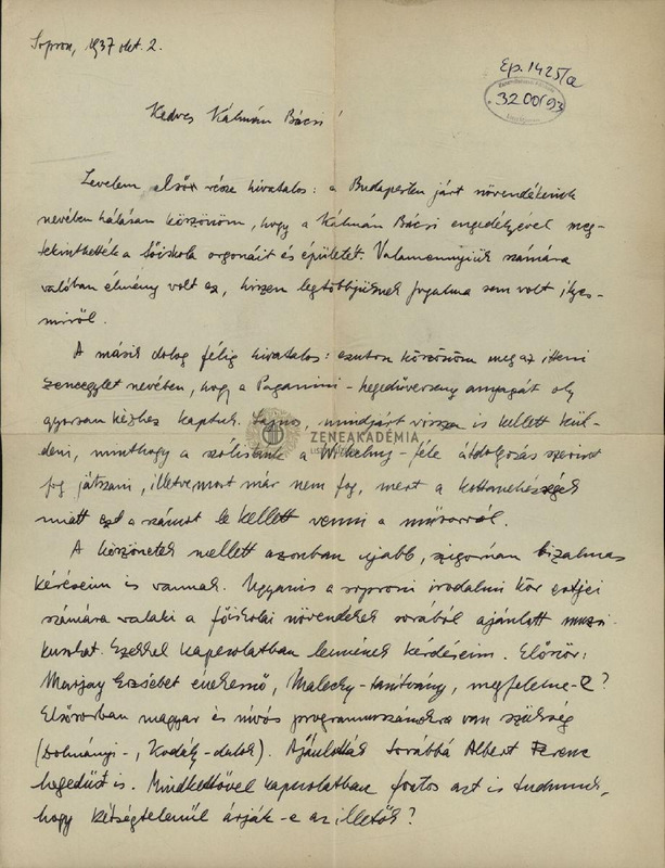 Gárdonyi Zoltán levele Isoz Kálmánhoz