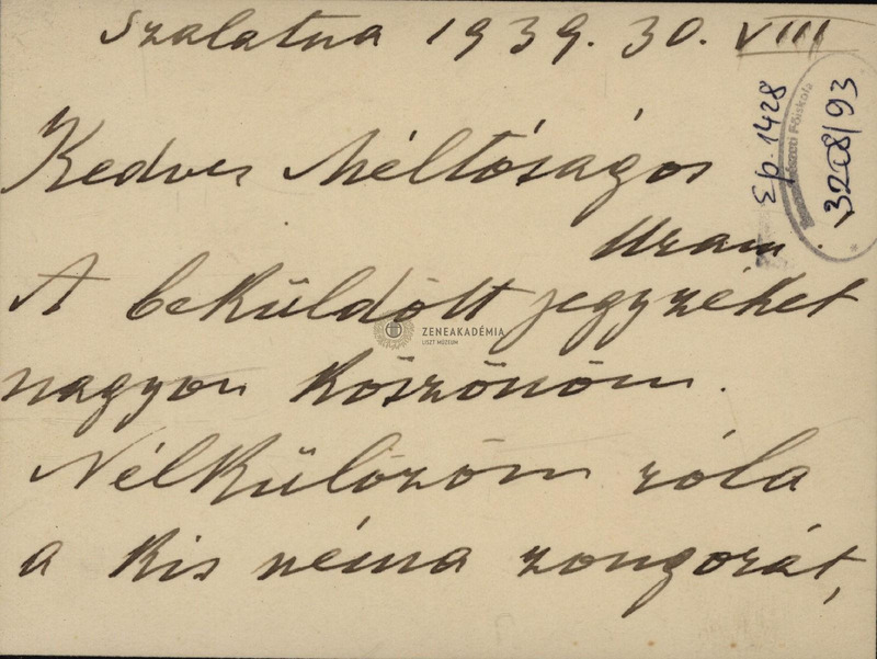 Fekete szegélyű kartonlapocskán. Köszöni a megküldött jegyzéket, hiányolja róla a néma zongorát.
