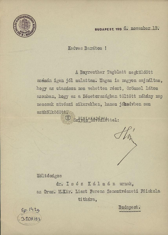 A Vallás- és Közoktatásügyi Minisztérium levélpapírja és borítékja. A Bayreuther Tagblatt megküldött számán jót mulatott.