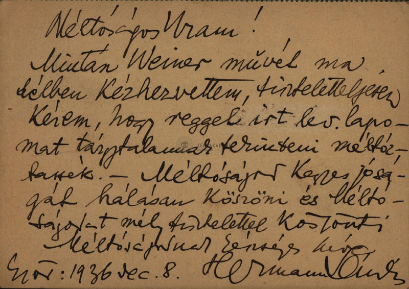Hermann László levelezőlapja Isoz Kálmánhoz