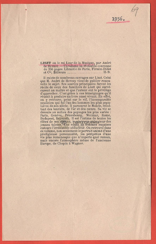 André de Hevesy: Liszt ou Roi Lear de musique c. könyvének rövid ismertetése.