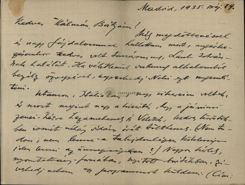 Fájdalommal értesült volt tanára, Laub István haláláról. Sikerei. A zenei hét műsorát kéri, haza is jöhetne rá, bármiben rendelkezésre áll.