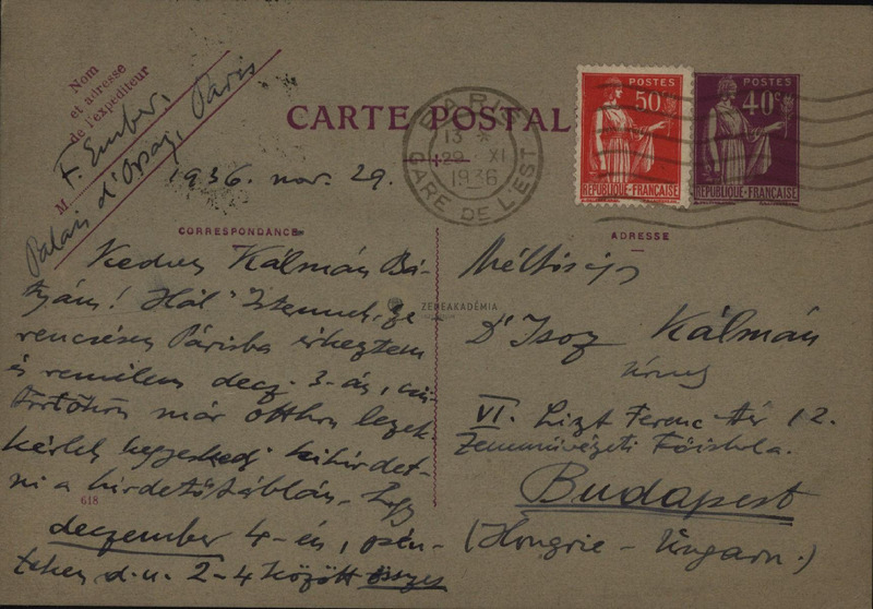 - dr. Ember Nándor levelezőlapja Isoz Kálmánhoz