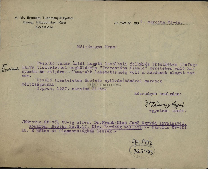 Előadását küldi a Protestáns Szemlébe. A soproni Erzsébet Tudományegyetem evangélikus hittudományi karának levélpapírja.