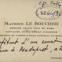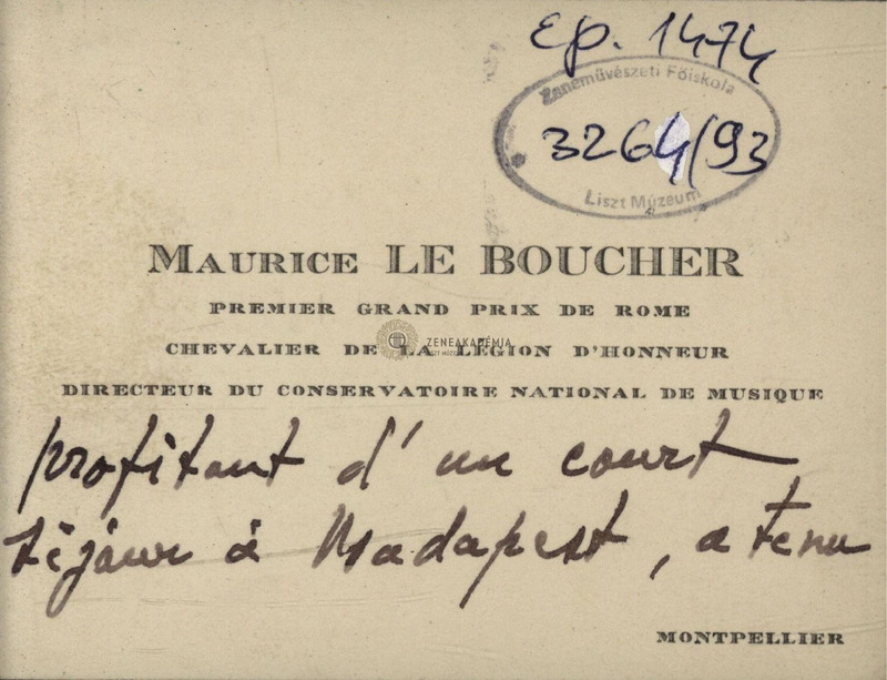 Névjegyre írva (Premier grand prix de Rome. Chevalier de la Légion dHonneur. Directeur du Conservatoire National de Musique, Montpellier). Budapesti tartózkodása alatt meglátogatta a Zeneakadémiát, de a vakáció miatt nem tudta nála tiszteletét tenni.