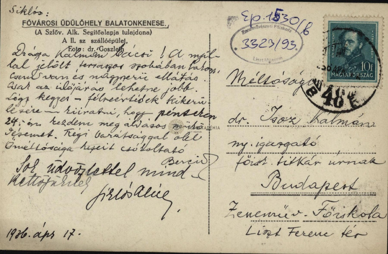 - Siklós Albert képeslapja Isoz Kálmánhoz