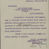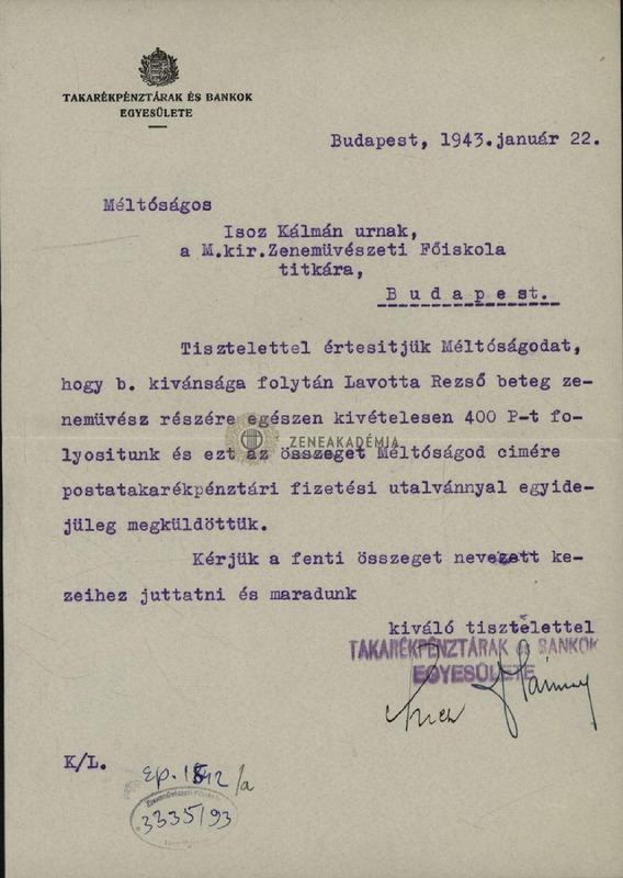 Értesítés: Lavotta Rezső számára 400 pengőt utaltak. Mellékletek: Lavotta átvételi elismervénye, köszönőlevél fogalmazványa a segítségért.