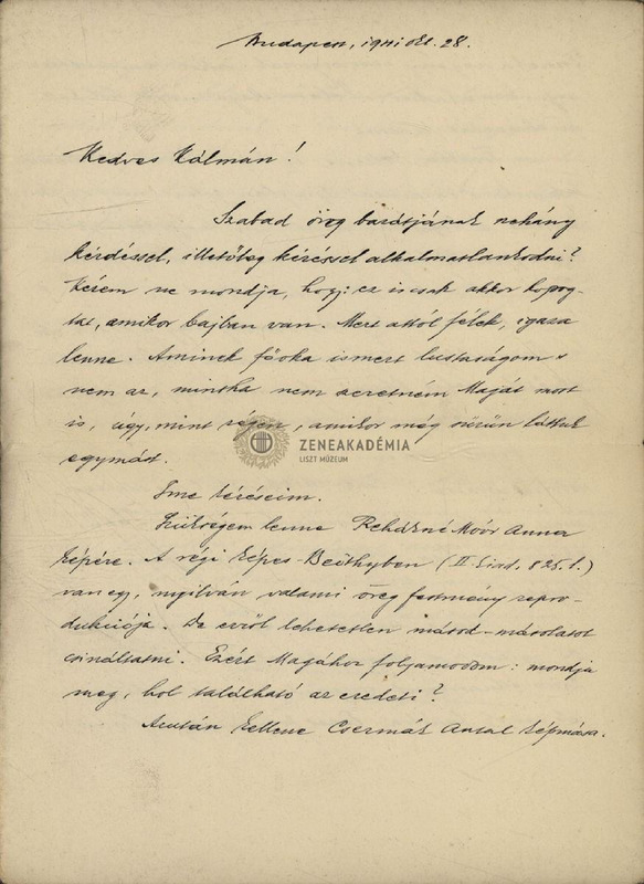 Kéréseit terjeszti elő: Rehákné Moór Anna portréja, Csermák Antal képmása, Liszt a pódiumon, verbunkost ábrázoló kép kellene neki a Magyar Művelődéstörténet kötetéhez.