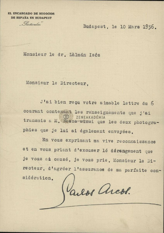 A budapesti spanyol követség levélpapírja. A küldött információkat és a két fotót továbbította M. Bacza-nak.
