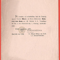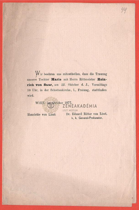 Értesítés Marie Liszt (Eduard lánya) és Heinrich von Saar házasságkötéséről.