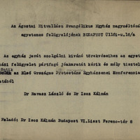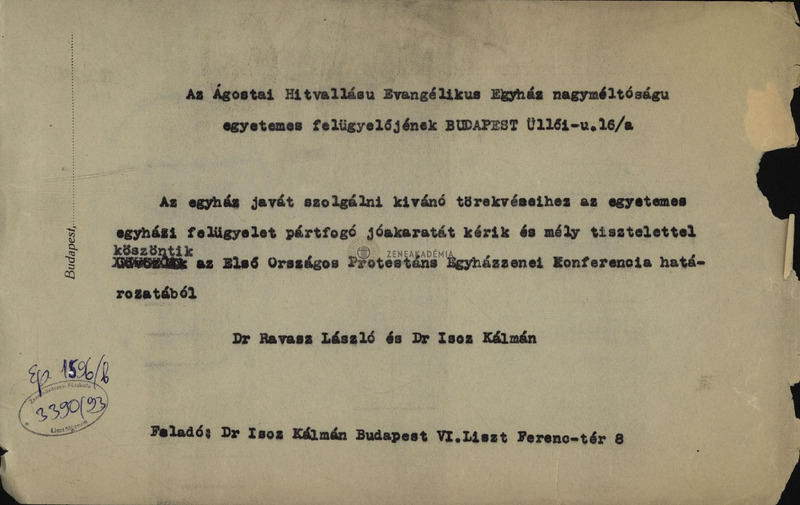 Az első országos protestáns egyházzenei konferencia határozatából üdvözletet küld és pártfogást kér a maga és Dr. Ravasz László nevében.