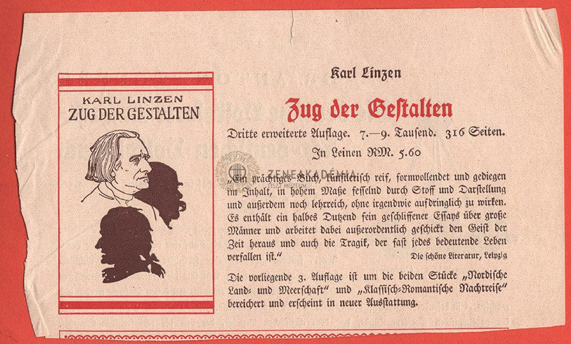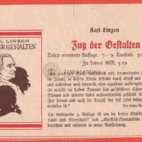 Karl Linzen: Zug der Gestalten c. könyvének (3. kiad) ajánlója. Hátoldalon Dr. Anton Stonner: Die deutsche Volkseele in christlich-deutschen Volksbrauch ajánló.