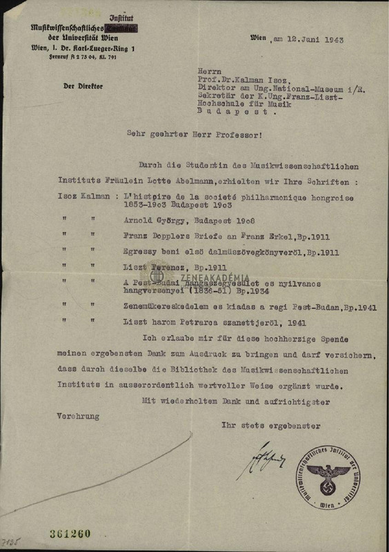 Musikwissenschaftliches Institut der Universität Wien igazgatójának levele Isoz Kálmánhoz