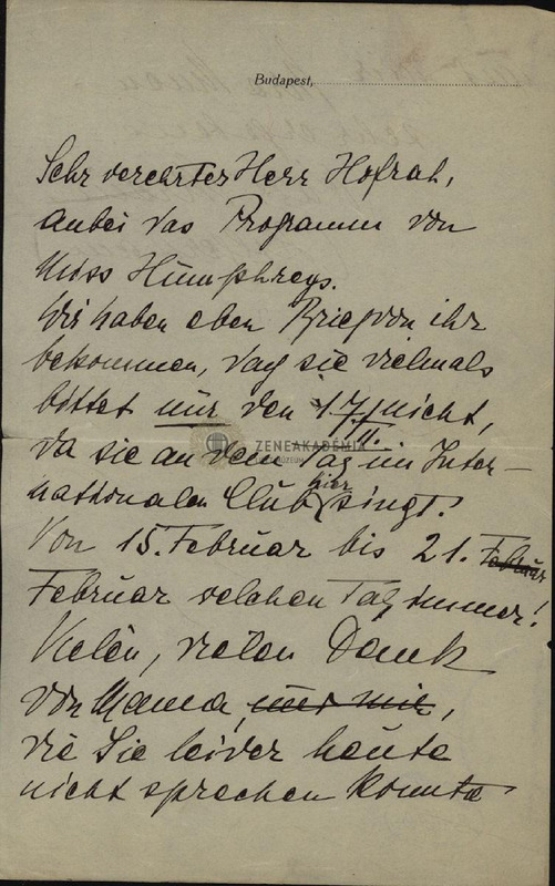 Miss Humphreys műsoráról. Tintás szöveg után ceruzával: Schumann: Auf dem Rhein / Loreley / Dem Gesicht / Erstes Grün / Der Nussbaum; Strauss R. Morgen / Die Nacht / Ruhe meine Seele / Allerseelen. Levélpapír tetején nyomtatva: Budapest, …