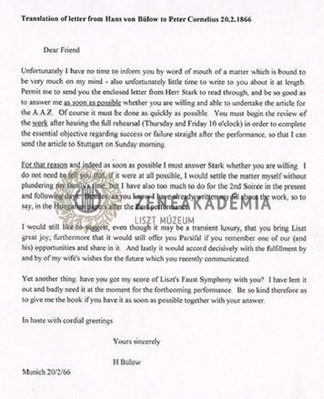 Hans von Bülow levele Peter Corneliushoz