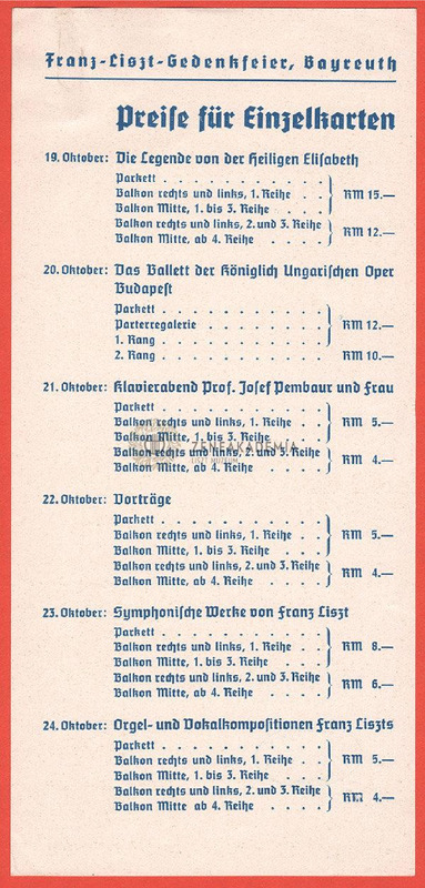 A belépőjegyek díjai a bayreuthi Liszt-emlékünnepség programjaira ill. szállásfoglaló lap az esemény idejére.