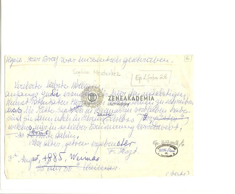 A Koppenhágai Királyi Könyvtárban található Liszt-levél kézírásos másolata Else Michelsen és Prahács Margit jegyzeteivel. Ugyanezen a másolaton névjegykártyára írt szöveg, ismeretlenhez, dátum nélkül („Mit Vergnügen, geehrter Herr, hört Ihren Vortrag des Rákoczy-Marsch...”).