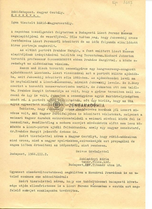 Szkladányi Mária levele a Moszkvai Rádió Magyar Osztályához
