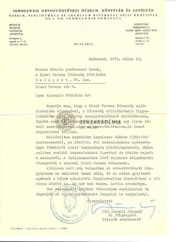 A Semmelweis Orvostörténeti Múzeum, Könyvtár és Levéltár h. főigazgatójának üdvözlete a Liszt Ferenc Társaság újjáalakulása alkalmából. Mellékeli Lumniczer Sándorról írt tanulmánya különlenyomatát.