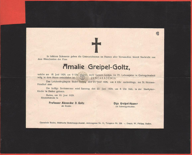 Gyászjelentés. Eduárd Lisztnek címezve Amalie Greipel- Goltz halálhíréről.