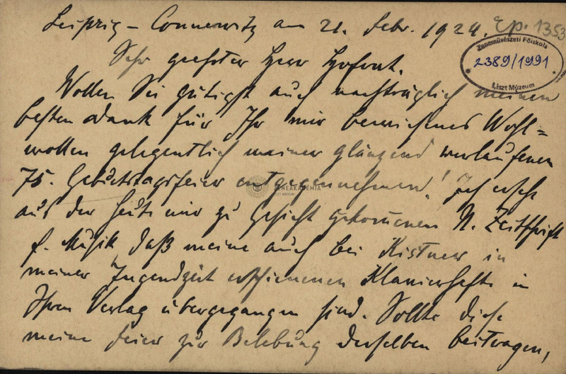 Köszöni a születésnapi jókívánságokat. Büszke rá, hogy Kistnernél megjelent fiatalkori zongoraműveit a Linnemann cég is megőrzi. Nem adták postára.