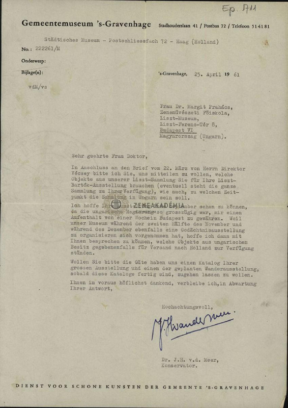 Szívesen kölcsönöz anyagot Liszt-gyűjteményéből a budapesti Liszt–Bartók kiállításra. Cserébe az őszi hollandiai emlékkiállítás számára kér anyagot.