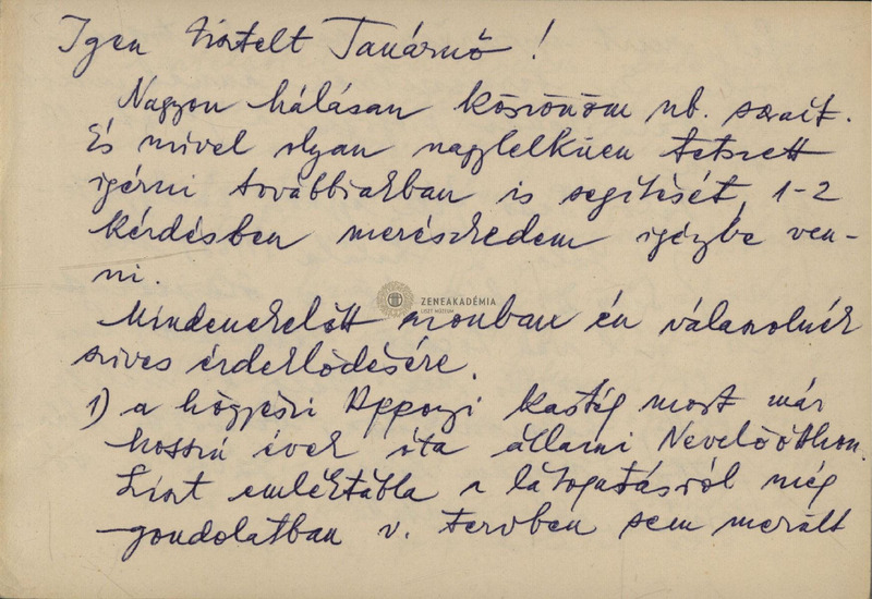 A hőgyészi Apponyi család; Liszt hőgyészi látogatása; a hőgyészi zeneiskola. Melléklet: címzett válaszlevelének másolata és jegyzetei.