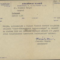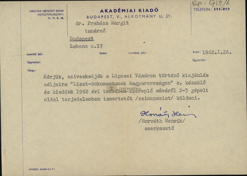 Készülő, magyarországi Liszt-dokumentumokról szóló kiadványa szinopszisát kéri.