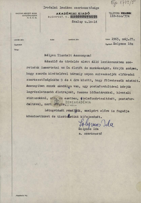 - Akadémiai Kiadó levele Prahács Margithoz
