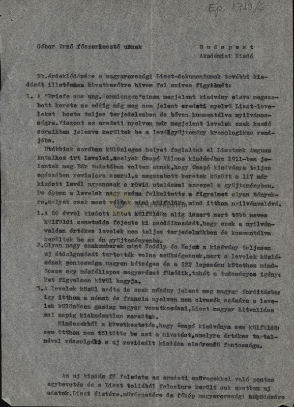 Fogalmazvánnyal. Az Akadémiai Kiadó főszerkesztőjét tájékoztatja a kiadásra váró magyarországi Liszt-dokumentumok kötetről.
