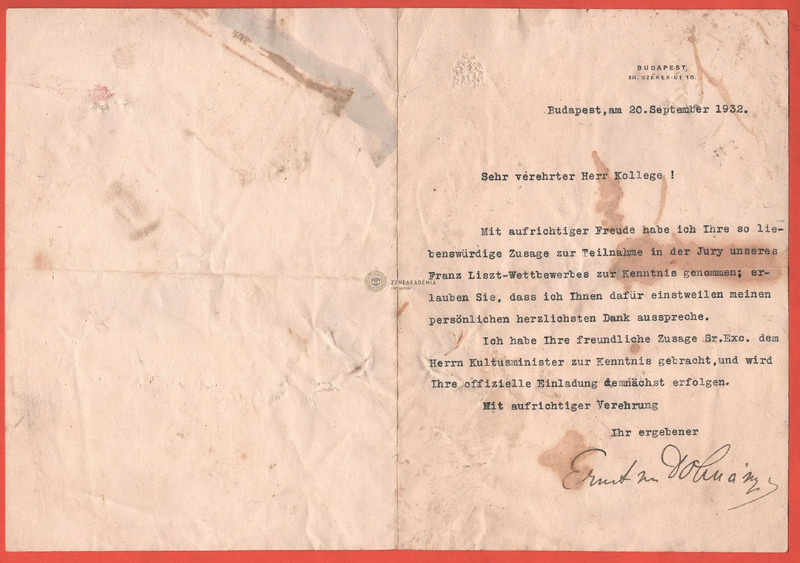 Mélynyomású címerrel, Budapest/XII. Széher-út 16 címmel előnyomott levélpapíron. Köszönetet mond tisztelt kollégájának, hogy vállalta a tervezett Liszt verseny zsűritagságát. Tudatja a miniszterrel, ezt követi a hivatalos meghívás.Az 1933. 05.04-20. megrendezett első Liszt verseny külföldi férfi zsűritagjait, akikkel feltehetőleg németül levelezett, és számításba jöhetnek címzettként, ld. a kapcsolódó személyek között. Melléklet: fotó, amelyen a felsoroltak közül Sauer látható.
