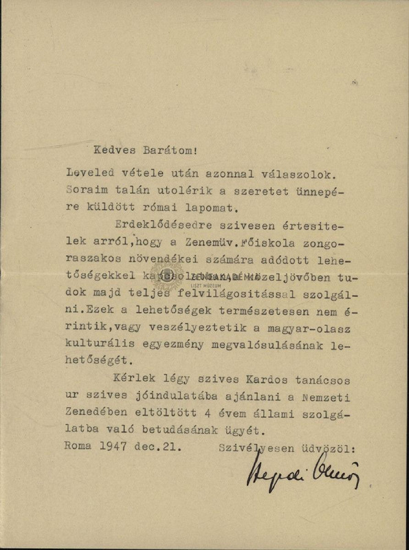 Képeslap: karácsonyi üdvözlet. Levél: magyar-olasz kulturális kapcsolatokról. A későbbiekben majd ír a Zeneakadémia zongoraszakos növendékeinek lehetőségeiről. Személyes kérés hivatalos ügyben.
