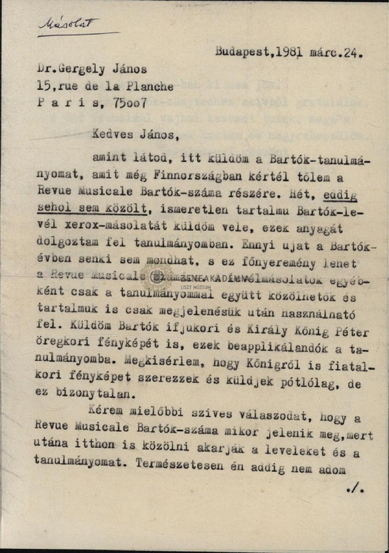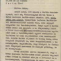 Elküldte Bartók-tanulmányát a Revue Musicale Bartók-száma részére. Fényképeket is mellékelt, várja a megjelenést. Gratulál címzett Bartók-könyvéhez. Melléklet: feladóvevény.