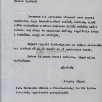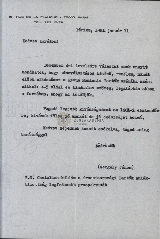 Helyesli a témaválasztást. Reméli, hogy mielőbb elkészül egy bizonyos cikk a Revue Musicale számára. Üdvözlet. Melléklet: Franciaországi Bartók Emlékbizottság prospektusa.