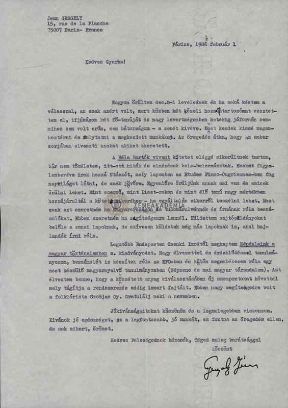 Gergely János levele Szomjas-Schiffert Györgyhöz