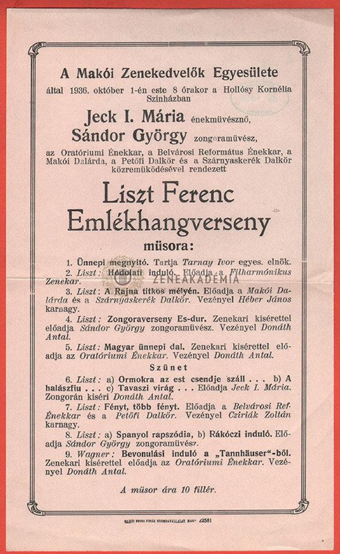 A Makói Zenekedvelők Egyesületének Liszt Ferenc emlékhangversenye.