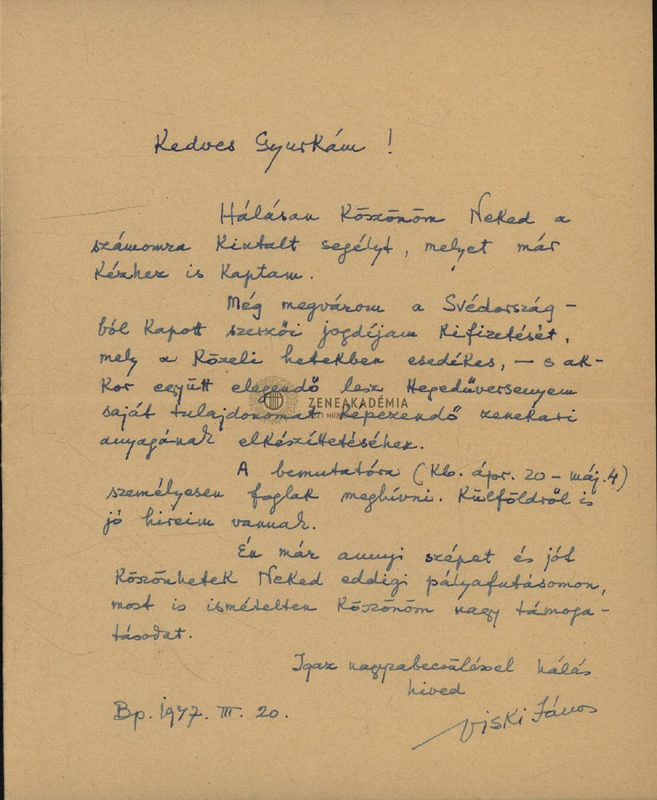 Köszönőlevél segélyért, amit hegedűversenye zenekari anyagának elkészítésére szán.