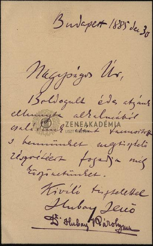 Hubay Jenő eredeti levele Gerlóczy Károlynak, borítékkal.