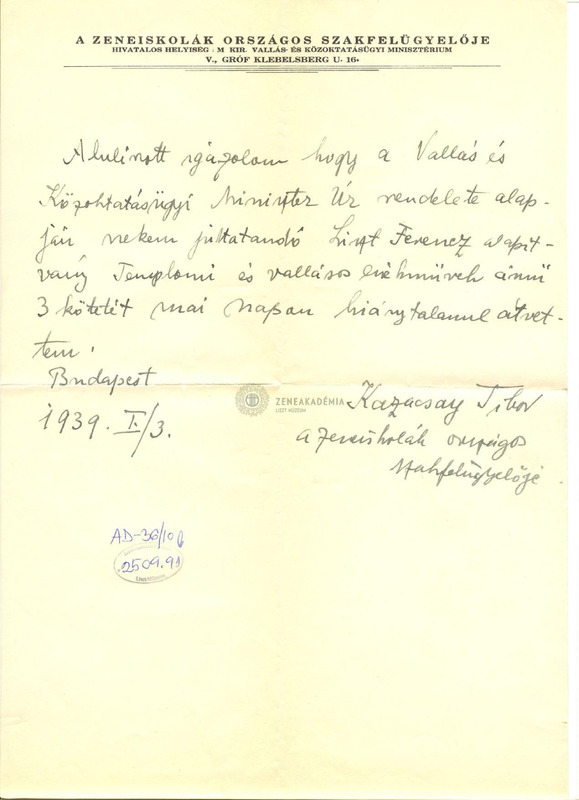 Kazacsay Tibor (a zeneiskolák országos szakfelügyelője) elismervénye a számára kiutalt Liszt-összkiadás "Templomi és vallásos énekművek" 3 kötetének hiánytalan átvételéről.